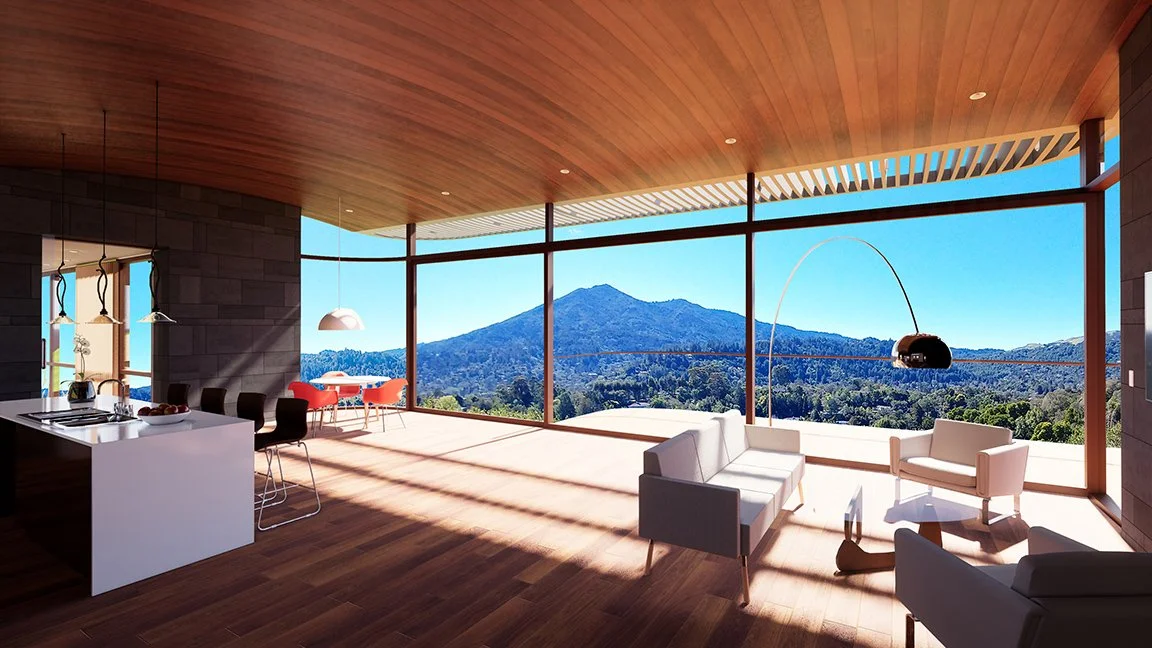 The client wished for a contemporary design that features curves and ample glass to maximize views towards Mount Tamalpais in Marin County.